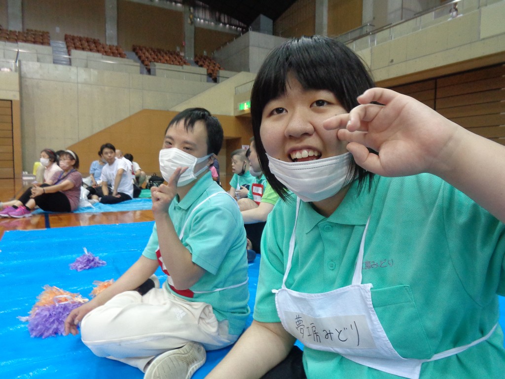 9月14日(土)は「育成会運動会」でした。開会式を終えると皆さん元気にラジオ体操で準備運動を行い、競技スタート!! 午前は、徒競走、運命ゲーム、綱引き、玉入れがありました。事業所対抗の運命ゲームでは、なんと夢工房みどりが1位を獲得し、みんなで大喜びしました。応援席では、ボンボンや「がんばれ」のパネルを使い、みんなで観戦を楽しみました。
