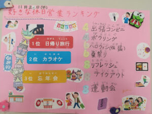 毎年各委員会が一回ずつ、委員会の内容に沿って皆さんにレクチャーしたり、報告したり、一緒に考えていく提起を行ったりする「みんなの会」という活動があります。先月は余暇委員会が主催となって「休日営業ランキング」という報告を行ないました。随分と昔に一度職員が利用者の皆さんに聞いて集計してランキングにしましたが、今年度は余暇委員の皆さんが立案し、アンケート・集計を行ってランキングを作成されました。