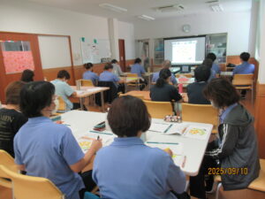 支援に関すること、制度に関すること、様々な内容を学び、新たな気づきを得たり、改めて支援の難しさを実感しながら利用者の方を思い浮かべたり、充実した研修となりました。今回学んだことを活かしていきたいと思います。